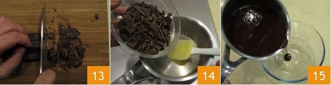 Jetzt kümmern Sie sich um die Mousse: Hacken Sie die dunkle Schokolade 13, bringen Sie in einem kleinen Topf Wasser zum Kochen, fügen Sie die Schokolade hinzu 14 und emulgieren Sie mit einem Teigspatel, gießen Sie die Schokoladenmischung in eine Schüssel 15 und tauchen Sie sie in eine größere Schüssel, die mit Eis gefüllt ist.