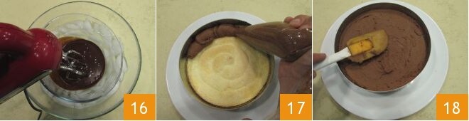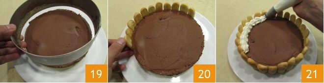 Schlagen Sie die Mischung mit einem elektrischen Mixer 16 für etwa 10-15 Minuten oder bis sie aufgeschlagen und kalt ist. Füllen Sie die Mousse in einen Spritzbeutel, verwenden Sie die Löffelbiskuitscheibe als Basis und drücken Sie die Mousse darauf 17, innerhalb des Rings mit einem Durchmesser von 18 cm und glätten Sie die Oberfläche mit einem Spatel 18, lassen Sie das Dessert im Kühlschrank für 1 Stunde fest werden.