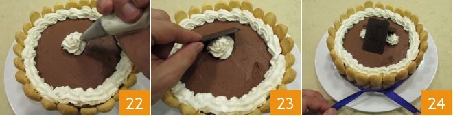 und dann einen Klecks in die Mitte 22. Beenden Sie das Ganze, indem Sie zwei Blätter in die Mitte legen 23 und die Charlotte mit Mousse aus dunkler Schokolade mit einem Satinband umwickeln 24.
