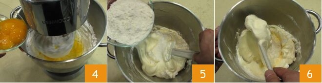 dann fügen Sie das Eigelb nacheinander hinzu 4, bis alles aufgeschlagen ist. Zum Schluss das gesiebte Mehl hinzufügen 5 und mit einem Spatel 6 mischen, um die Zutaten zu kombinieren.