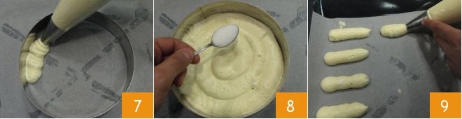 Dann geben Sie den Teig in einen Spritzbeutel. Jetzt legen Sie ein Backblech mit Backpapier aus und legen einen Stahlring mit einem Durchmesser von 18 cm darauf, drücken Sie den Teig hinein, um eine Scheibe 7 zu formen, die die Basis der Charlotte bilden wird, bestreuen Sie die Oberfläche mit Zucker 8 und backen Sie im vorgeheizten statischen Ofen bei 190°C für 10 Minuten (oder im Umluftofen bei 170°C für etwa 8 Minuten). Drücken Sie den restlichen Teig auf ein weiteres mit Backpapier ausgelegtes Backblech, um Löffelbiskuits von 6 cm Länge zu formen 9, es werden etwa 24.