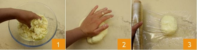 Um die Cicatielli mit Miesmuscheln und Bohnen zuzubereiten, beginnen Sie mit der frischen Pasta: Geben Sie den Grieß in eine Schüssel, fügen Sie das lauwarme Wasser und das Olivenöl hinzu. Beginnen Sie, die Zutaten in der Schüssel zu vermischen 1 und sobald der Teig fester wird, übertragen Sie ihn auf eine leicht bemehlte Arbeitsfläche und kneten Sie ihn kräftig 2, bis Sie einen glatten und elastischen Teig erhalten. Wickeln Sie ihn in Frischhaltefolie und lassen Sie ihn etwa 30 Minuten bei Raumtemperatur ruhen.