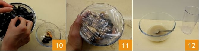 Seihen Sie die Miesmuscheln ab und bewahren Sie die Flüssigkeit auf, die zum Würzen der Sauce verwendet wird, lassen Sie einige Miesmuscheln ganz, während Sie das Fleisch aus den meisten Miesmuscheln herausnehmen 10. Decken Sie das Fleisch mit Frischhaltefolie ab und bewahren Sie es zusammen mit der Kochflüssigkeit auf (11-12).