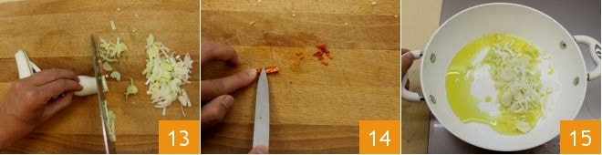 Putzen und hacken Sie die Frühlingszwiebel 13, entfernen Sie die inneren Samen der Chilischote und hacken Sie diese ebenfalls fein 14. Geben Sie das Öl, den geschälten halbierten Knoblauch und die gehackte Frühlingszwiebel in eine Pfanne mit hohem Rand 15
