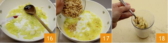Schalten Sie die Hitze auf sehr niedrig und rühren Sie um, um die Frühlingszwiebel weich zu machen; dann fügen Sie auch die gehackte Chilischote hinzu 16. Geben Sie die Cannellini-Bohnen hinzu (wir haben bereits gekochte verwendet, aber Sie können auch getrocknete verwenden, nachdem Sie diese eingeweicht und separat gekocht haben) 17 und lassen Sie sie etwa zehn Minuten lang kochen und würzen. Dann schalten Sie die Hitze aus und nehmen zwei Esslöffel heraus: Geben Sie diese in einen hohen Behälter zusammen mit der Flüssigkeit der Miesmuscheln 18