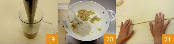 Pürieren Sie alles mit einem Stabmixer 19 und geben Sie die Creme dann in die Pfanne mit den Bohnen 20. Nehmen Sie den Teig, teilen Sie ihn in Stücke, um dünne Stränge zu formen 21.