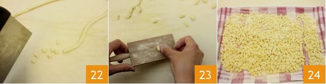 Teilen Sie dann jeden Strang in Stückchen von 1-1,5 cm 22: Um die typische Vertiefung der Cicatielli zu schaffen, drücken Sie mit dem Daumen jedes Teigstück auf das Rillenbrett 23: Sie können auch mit dem Daumen drücken und jedes Stück leicht auf einer glatten Arbeitsfläche ziehen. Während Sie sie herstellen, können Sie sie auf ein mit einem leicht bemehlten Tuch belegtes Tablett legen 24.
