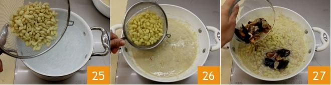Um die Cicatielli zu kochen, bringen Sie reichlich gesalzenes Wasser in einem großen Topf zum Kochen und geben Sie sie hinein, um sie wenige Minuten zu kochen, 2-3 Minuten reichen aus, dann seihen Sie sie ab und setzen die Garzeit in der Pfanne mit der Bohnensauce fort 26. Schalten Sie die Hitze auf mittlere Stufe, rühren Sie um und fügen Sie auch die beiseitegestellten Miesmuscheln hinzu 27.