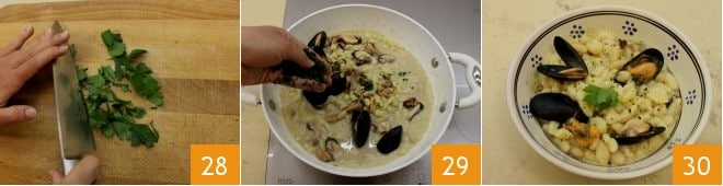 Schließlich hacken Sie die Petersilienbüschel fein 28 und geben diese in die Pfanne 29: Schalten Sie die Hitze aus, und Ihre Cicatielli mit Miesmuscheln und Bohnen sind bereit zum Genießen 30!