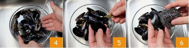 Fahren Sie mit der Reinigung der Miesmuscheln fort: Spülen Sie sie gründlich unter fließendem Wasser ab 4, ziehen Sie dann den Byssus heraus 5, den Bart, der aus der Schale heraustritt, und schrubben Sie jede Muschel, um die Verschmutzungen zu entfernen 6.