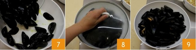 Geben Sie etwas Öl in eine Pfanne und erhitzen Sie es leicht, dann geben Sie die Miesmuscheln hinzu 7, rühren Sie um und decken Sie die Pfanne mit einem Deckel ab, damit sie sich durch den Dampf öffnen 8. Sobald sie alle geöffnet sind, schalten Sie die Hitze aus 9
