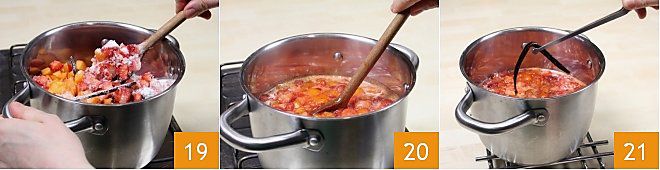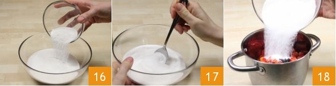In einer Schüssel geben Sie 350 g Kristallzucker und fügen Sie das 3:1-Vorbereiten hinzu 16, dann mischen Sie die beiden Zutaten mit einem Löffel 17. Geben Sie den Zucker mit dem kalten Vorbereiten direkt in den Topf zum Obst hinzu 18,