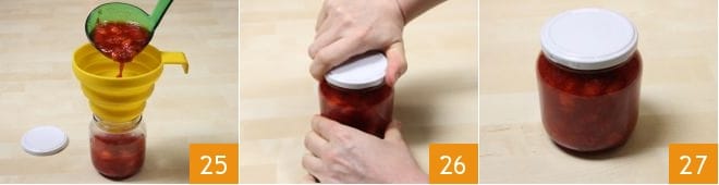 und fahren Sie fort, bis die Gläser gefüllt sind, wobei Sie darauf achten, etwa 1 cm vom Rand frei zu lassen 25. Verschließen Sie sie dann mit den entsprechenden Deckeln 26, ziehen Sie sie gut fest und stellen Sie sicher, dass sie luftdicht verschlossen sind. Durch die Wärme der Konfitüre entsteht ein Vakuum, das eine lange Haltbarkeit des Produkts ermöglicht. Sobald die Gläser abgekühlt sind, überprüfen Sie, ob das Vakuum korrekt erfolgt ist: Sie können in die Mitte des Deckels drücken, und wenn Sie das typische "Klick-Klack" nicht hören, wurde das Vakuum gebildet. Ihre Erdbeer-Aprikosen-Konfitüre mit Vanille ist bereit 27.