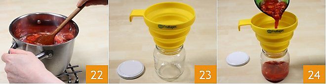 und rühren Sie die Konfitüre um, damit sich der eventuell entstandene Schaum auflöst 22. Bereiten Sie die Gläser vor, die Sie sterilisiert haben, und besorgen Sie sich einen Trichter, um das Einfüllen der Konfitüre zu erleichtern 23. Füllen Sie die Gläser mit Hilfe eines Schöpflöffels mit der noch heißen Erdbeer-Aprikosen-Konfitüre mit Vanille 24