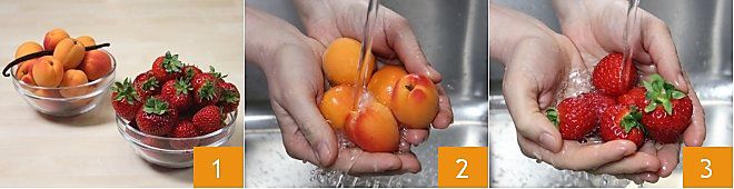 Um die Erdbeer-Aprikosen-Konfitüre mit Vanille zuzubereiten 1, beginnen Sie damit, die Aprikosen und Erdbeeren unter fließendem Wasser zu waschen (2-3).