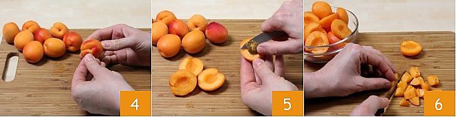 Entfernen Sie mit den Fingern den Stielansatz der Aprikosen 4, dann entfernen Sie den Kern, indem Sie die Aprikosen mit einem kleinen Messer halbieren 5; schließlich schneiden Sie die Aprikosen in kleine Stücke 6.