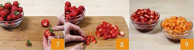 Putzen Sie die Erdbeeren, indem Sie den Stielansatz entfernen 7 und schneiden Sie sie ebenfalls in kleine Stücke 8. Sammeln Sie die Obststücke in zwei Schüsseln 9.