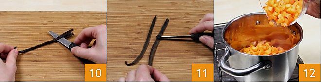 Schneiden Sie eine Vanilleschote der Länge nach auf 10 und entnehmen Sie mit der Spitze eines kleinen Messers die Samen 11. Alternativ können Sie ein Päckchen Vanillin oder einen Teelöffel Vanilleextrakt verwenden. In einem hohen, großen Edelstahltopf geben Sie die Aprikosenstücke 12 hinzu.