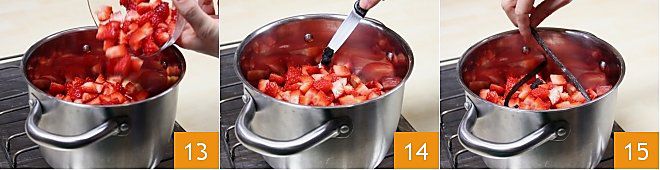 und die Erdbeerstücke 13. Fügen Sie die Vanillesamen zum Obst im Topf hinzu 14, zusammen mit der eingeschnittenen Schote 15; die Vanille verleiht der Konfitüre einen intensiveren Geschmack. Diese Schritte sollten bei ausgeschaltetem Herd durchgeführt werden.