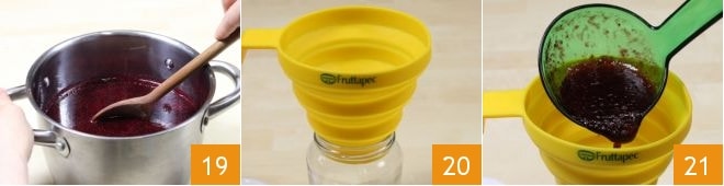 vollständig auflöst 19. Bereiten Sie die Gläser vor, die Sie sterilisiert haben, und besorgen Sie sich einen Trichter, um das Einfüllen der Konfitüre zu erleichtern 20. Gießen Sie die noch heiße Konfitüre mit Hilfe einer Kelle 21 ein und