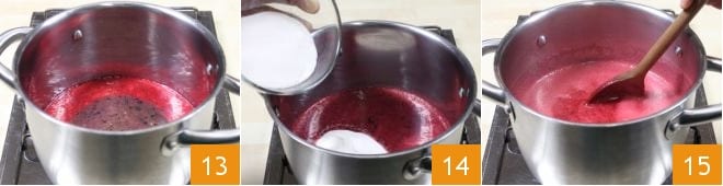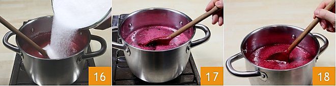 Nach 1 Minute fügen Sie den Zucker hinzu 16 und bringen die Mischung erneut zum Kochen. Lassen Sie sie 3 Minuten bei starker Hitze kochen 17, dabei ständig rühren. Nehmen Sie den Topf vom Herd und rühren Sie weiter, damit sich der eventuell entstandene Schaum auf der Oberfläche 18,
