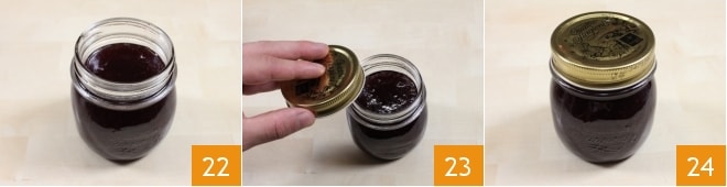 füllen Sie die Gläser, wobei Sie darauf achten, 1 cm vom Rand frei zu lassen 22, dann verschließen Sie sie mit den geeigneten Deckeln 23, indem Sie diese fest anziehen und sicherstellen, dass sie luftdicht sind. Durch die Hitze der Konfitüre entsteht ein Vakuum, das eine lange Haltbarkeit des Produkts ermöglicht. Sobald die Gläser abgekühlt sind, prüfen Sie, ob das Vakuum korrekt entstanden ist: Sie können auf die Mitte des Deckels drücken, und wenn Sie nicht das klassische "Klick-Klack" hören, ist das Vakuum entstanden. Ihre rote Johannisbeer- und Blaubeerkonfitüre ist fertig 24.