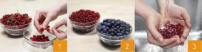 Um die rote Johannisbeer- und Blaubeerkonfitüre zuzubereiten, beginnen Sie damit, die Johannisbeeren vorsichtig von den Zweigen zu trennen und sie in eine kleine Schüssel zu legen 1. Bereiten Sie auch eine kleine Schüssel für die Blaubeeren vor 2. Waschen Sie zuerst die Johannisbeeren 3 und dann