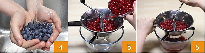 die Blaubeeren unter fließendem Wasser 4. Besorgen Sie sich eine Passiermühle mit großen Löchern und stellen Sie sie über eine große Schüssel, um den Fruchtsaft aufzufangen; geben Sie die Johannisbeeren in die Passiermühle 5 und passieren Sie sie mehrmals, indem Sie sanft drehen 6,