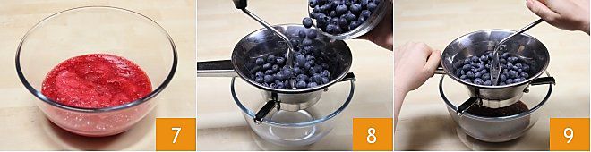 um den Saft und das Fruchtfleisch der Johannisbeeren zu gewinnen 7. Geben Sie die Blaubeeren in die Passiermühle 8; passieren Sie auch diese mehrmals mit langsamen Bewegungen 9,