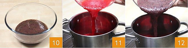 um den Saft und das Fruchtfleisch der Blaubeeren zu erhalten 10. In einem hohen und großen Edelstahltopf geben Sie zuerst das Johannisbeerfruchtfleisch 11 und dann das Blaubeerfruchtfleisch 12.