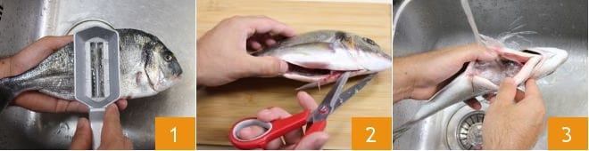 Um die Dorade auf mediterrane Art zuzubereiten, beginnen Sie mit der Wie man die Goldbrasse putzt: Nehmen Sie jede Dorade, schneiden Sie die Flossen mit einer Schere ab und schuppen Sie sie mit dem entsprechenden Werkzeug oder mit einer Messerklinge, indem Sie sie mehrmals vom Kopf bis zum Schwanz führen 1. Schneiden Sie nun mit der Schere den Bauch des Fisches vom Schwanz bis zum Kopf auf und entfernen Sie die inneren Eingeweide 2, spülen Sie dann die Dorade unter fließendem Wasser ab, um alle Rückstände sowohl innen als auch außen zu entfernen 3.