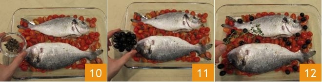 Verteilen Sie sie in der Form um die beiden Doraden, spülen Sie dann die Kapern gründlich unter fließendem Wasser ab, um das überschüssige Salz zu entfernen, und geben Sie sie zu den Doraden 10, fügen Sie auch die entsteinten schwarzen Oliven hinzu 11, würzen Sie mit ein paar Zweigen frischen Thymians 12.