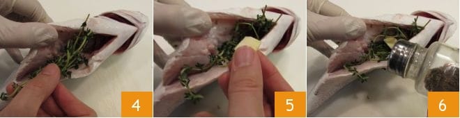 Füllen Sie jede Dorade mit den Aromen: den Zweigen frischen Thymians 4, einer geschälten Knoblauchzehe 5 und schließlich salzen und pfeffern Sie 6.