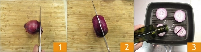 Um die falsche Carbonara zuzubereiten, beginnen Sie mit den Zwiebeln. Schälen Sie sie 1 und schneiden Sie sie in zwei Hälften 2. Legen Sie die Zwiebeln auf einen Grill und geben Sie etwas Öl darüber 3.