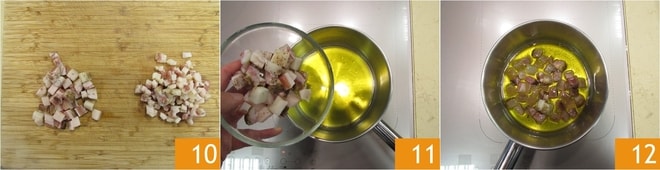 Die übrigen 80 g schneiden Sie in kleinere Würfel 10. Jetzt geben Sie in eine kleine Pfanne etwas Öl, erhitzen es und fügen die größeren Guanciale-Würfel hinzu 11. Lassen Sie es köcheln 12, bis es gut gewürzt aber noch weich ist. Dann lassen Sie es im Öl abkühlen.