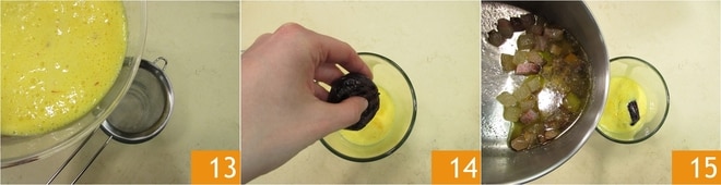 Filtern Sie die Creme aus Büffelmilch und Safran 13 und geben Sie sie in einen hohen, schmalen Behälter. Fügen Sie die gegrillten Zwiebeln hinzu und entfernen Sie den zu dunklen Teil 14, da dieser zu bitter sein und die Farbe Ihrer Creme verändern könnte. Fügen Sie dann auch den Guanciale mit seinem Öl hinzu 15.