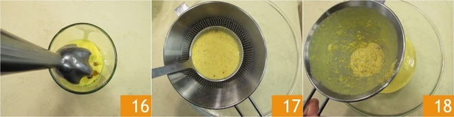 Pürieren Sie mit einem Stabmixer 16 und geben Sie die Mischung in ein feines Sieb über einer Schüssel 17. Filtern Sie es, um eine glatte Creme zu erhalten 18.