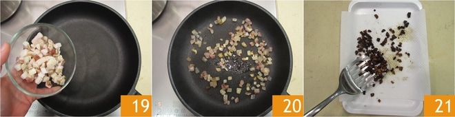 Jetzt geben Sie die in kleine Würfel geschnittenen Guanciale in eine heiße Pfanne 19. Lassen Sie es rösten 20, bis es knusprig ist. Dann geben Sie es auf ein kleines Tablett mit Küchenpapier und lassen es ruhen 21.