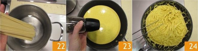 Jetzt ist es Zeit, die Pasta in kochendem, nach Geschmack gesalzenem Wasser zu kochen 22. Geben Sie die gewonnene Sauce in eine Pfanne, würzen Sie sie mit Salz und Pfeffer 23. Erhitzen Sie sie und sobald die Pasta al dente ist, gießen Sie sie ab und geben sie hinein. Rühren Sie um 24 und schwenken Sie, um alles gut zu vermischen.