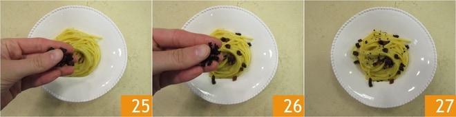 Geben Sie die Pasta auf die Teller, beenden Sie mit dem knusprigen Guanciale 25 und dem Pulver aus Caiazzaner Oliven 26. Die falsche Carbonara ist servierbereit.