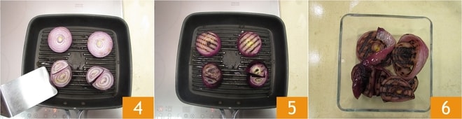 Lassen Sie sie grillen, dann drehen Sie sie auf die andere Seite 4 und fügen Sie noch etwas Öl hinzu. Grillen Sie die Zwiebeln weiter für etwa 15 Minuten und drehen Sie sie gelegentlich 5. Sie sollten weich und gut gegrillt sein. Dann in eine Schüssel geben und abkühlen lassen 6.