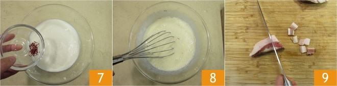 Gießen Sie jetzt die Büffelmilch in eine Schüssel und lassen Sie die Safranfäden 7 darin ziehen. Rühren Sie mit einem Schneebesen 8, bis sich der Safran aufgelöst hat und die Creme die gleiche Farbe wie das Eigelb hat. Bearbeiten Sie nun den Guanciale. Schneiden Sie die 200 Gramm in größere Würfel 9.