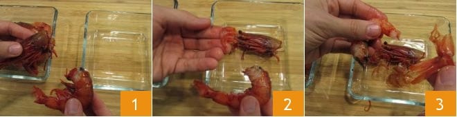 Um die Fingerfood aus Büffelkäse zuzubereiten, beginnen Sie mit der Reinigung der roten Garnelen: Trennen Sie den Kopf 1, die Beine 2 und den Panzer inklusive Schwanz 3.