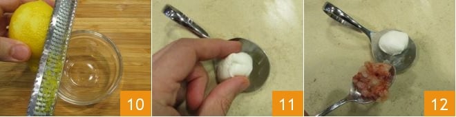 Reiben Sie die Zitronenschale ab und sammeln Sie sie in einer kleinen Schüssel 10. Alles ist bereit, um die Fingerfood aus Büffelkäse und Garnelen zusammenzusetzen: Nehmen Sie einen Aperitiflöffel und legen Sie ein Büffelmozzarella-Bällchen darauf 11, geben Sie auch die Garnelen darauf 12.