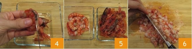 Schneiden Sie den Rücken mit einem kleinen Messer ein und entfernen Sie den Darm, das heißt, den schwarzen Faden 4. Sobald die Garnelen gereinigt sind 5, hacken Sie sie mit dem Messer, ohne sie zu stark zu zerhacken 6.