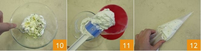 und alles verrühren, um es zu verbinden 10. Sobald eine homogene Creme entstanden ist, füllen Sie sie in einen Einweg-Spritzbeutel 11 mit 6 mm Sterntülle.