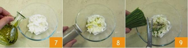 In einer Schüssel den Ziegenkäse und das Olivenöl extra vergine 7, Salz und Pfeffer 8 geben; fügen Sie den gehackten Schnittlauch hinzu, indem Sie den grünsten und duftenden Teil nehmen 9