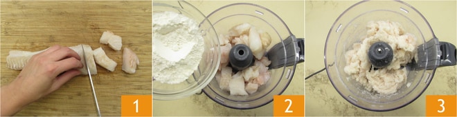 Um die Fischstäbchen zuzubereiten, schneiden Sie den Kabeljau in Stücke 1 und geben Sie ihn zusammen mit dem Mehl 2 in einen Mixer mit Klingen. Mixen Sie, bis sich der Kabeljau von den Wänden löst 3.