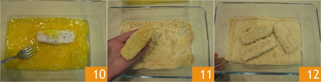 Wenden Sie jedes Stäbchen in den mit Salz und Pfeffer verquirlten Eiern 10 und im Paniermehl 11, wiederholen Sie diesen Vorgang zweimal, um eine knusprigere Panade zu erhalten 12.
