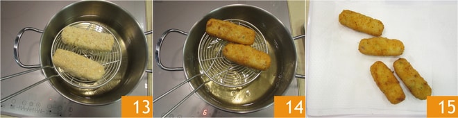 Erhitzen Sie das Öl auf 165°C, frittieren Sie maximal zwei Stäbchen gleichzeitig 13 für etwa 2 Minuten, bis sie schön goldbraun sind 14. Lassen Sie die Fischstäbchen auf Küchenpapier abtropfen und servieren Sie sie heiß 15.